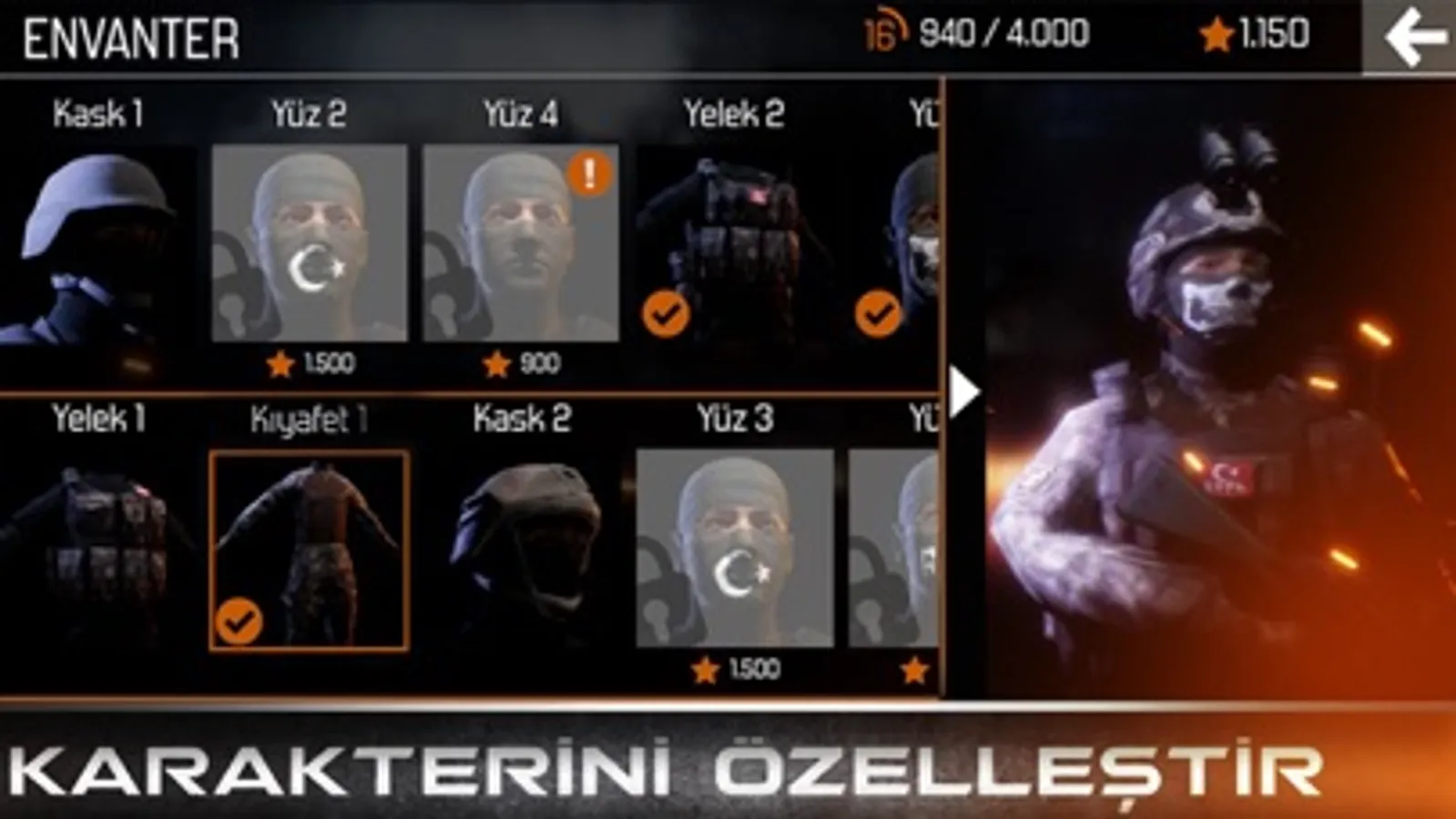 With the points you gain from the operations, customize your characters. Buy new equipments such as Helmets, Vests, Camoflage suits and more!