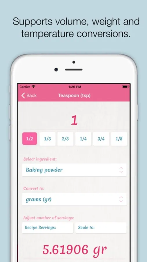 * Enter amounts and view results in standard cooking fractions (1/2, 1/3, etc )