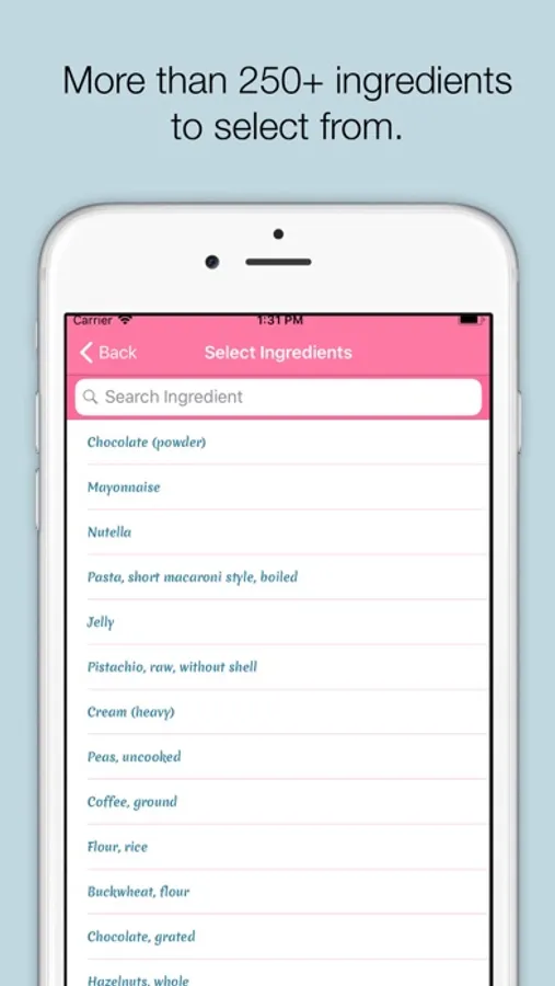 It comes with a database of common ingredients based on weight figures from the USDA (US Department of Agriculture).