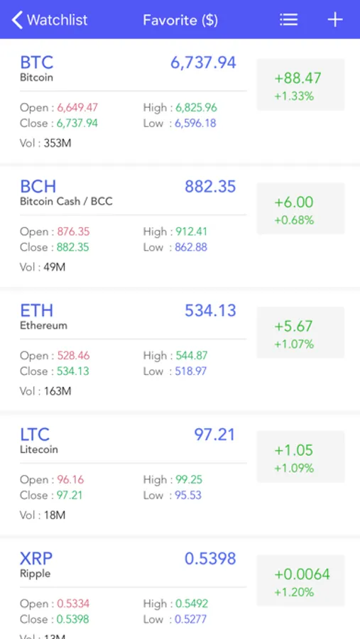 You can start with a list sorted by the market cap of each coin, which helps you to monitor the individual strength and trend. For those crypto coins that you are interested in, you may simply add them to a user-friendly watchlist and track them with advanced quotes anytime.