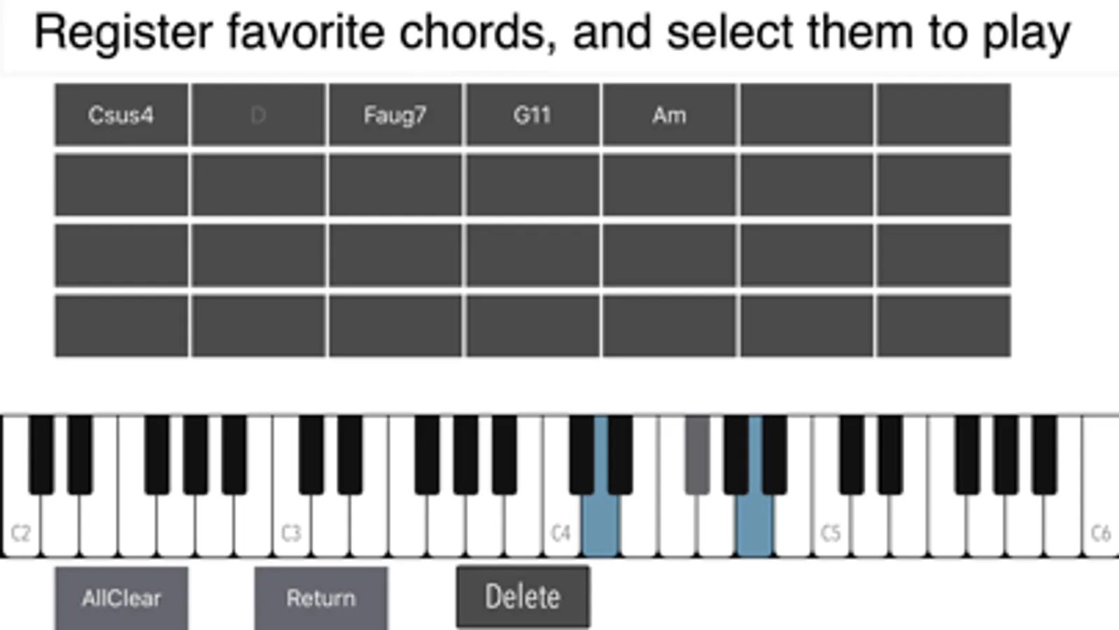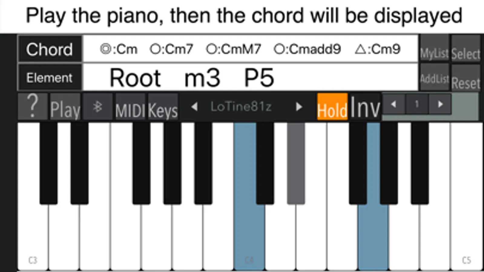 Press the key on the piano to judge the chords. There is also a function to select a chord and check its constituent sound.