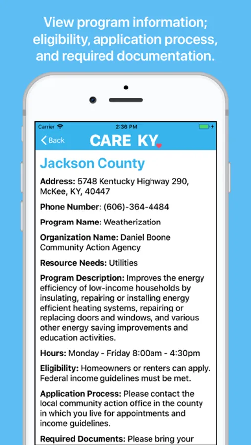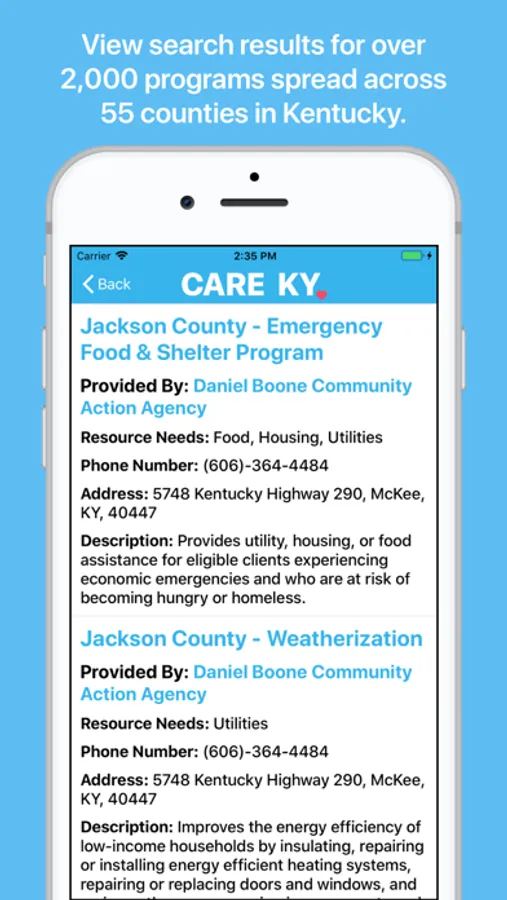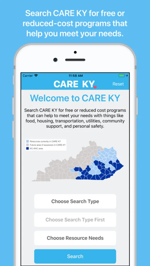 The University of Kentucky's Center for Health Services Research (CHSR) has developed CARE KY in collaboration with the Kentucky Consortium for Accountable Health Communities project. The project connects the residents of all 120 counties in the state of Kentucky to the community resources they need. This application was designed as a companion for www.care-ky.org that does not require an internet connection.