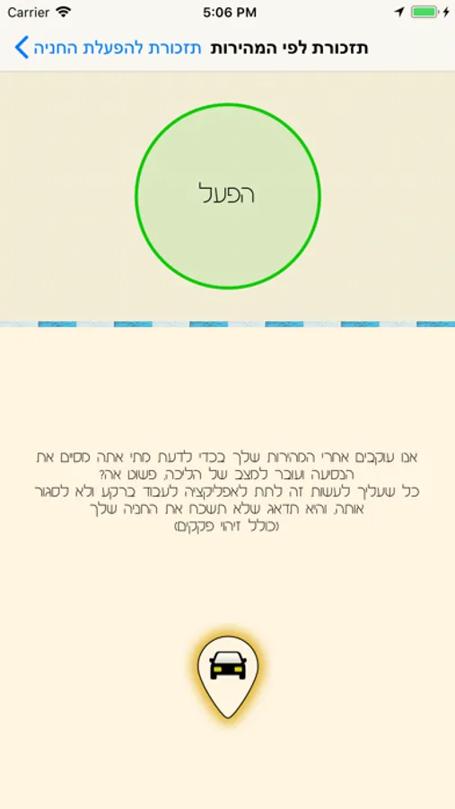 כשאתם מפעילים את החניה פשוט תלחצו על מיקום וסמנו את מיקום הרכב, וכשתחזרו אליו הוא יתריע לכם(אופציה זאת לא מנצלת סוללה כלל)