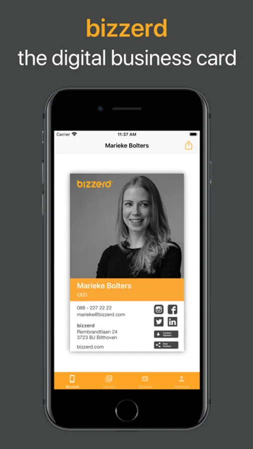bizzerd is the first, paperless business card in your corporate identity. Easy to use, with and without the app. When using the bizzerd app, you’ve always got your own business cards within reach and those of every colleague and business partner.