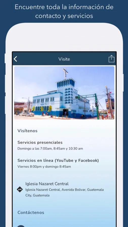 Adicionalmente, aquí podrá conocer toda la información acerca de la iglesia, su historia, ministerios, ubicación, parqueos, así como eventos, el boletín mensual. También podrá enviar sus peticiones de oración y testimonios directamente desde el app.