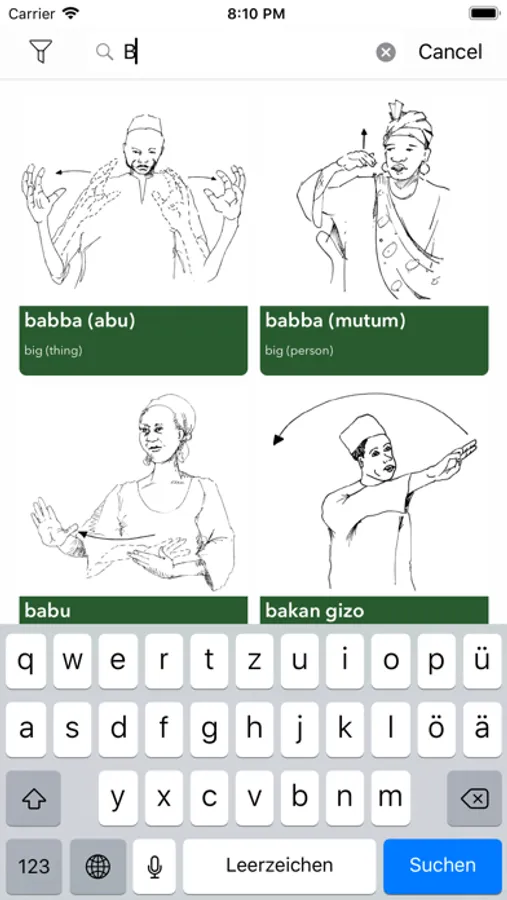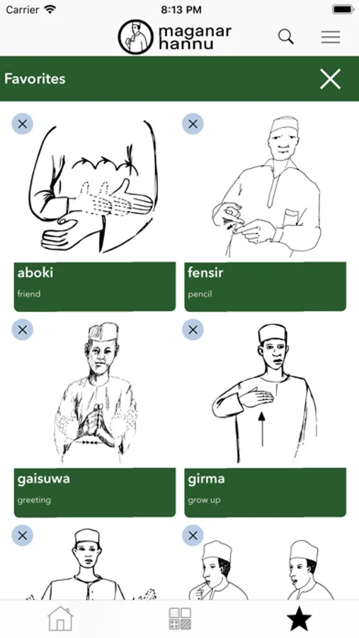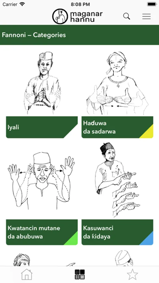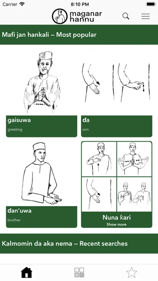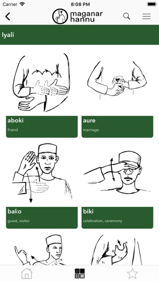 This dictionary of Hausa Sign Language contains around 500 signs, each with a translation into spoken Hausa and English. The signs are arranged in thematic fields. The search button allows you to find signs by typing in words in either language. All pictures are built into the application so that they can be viewed offline.