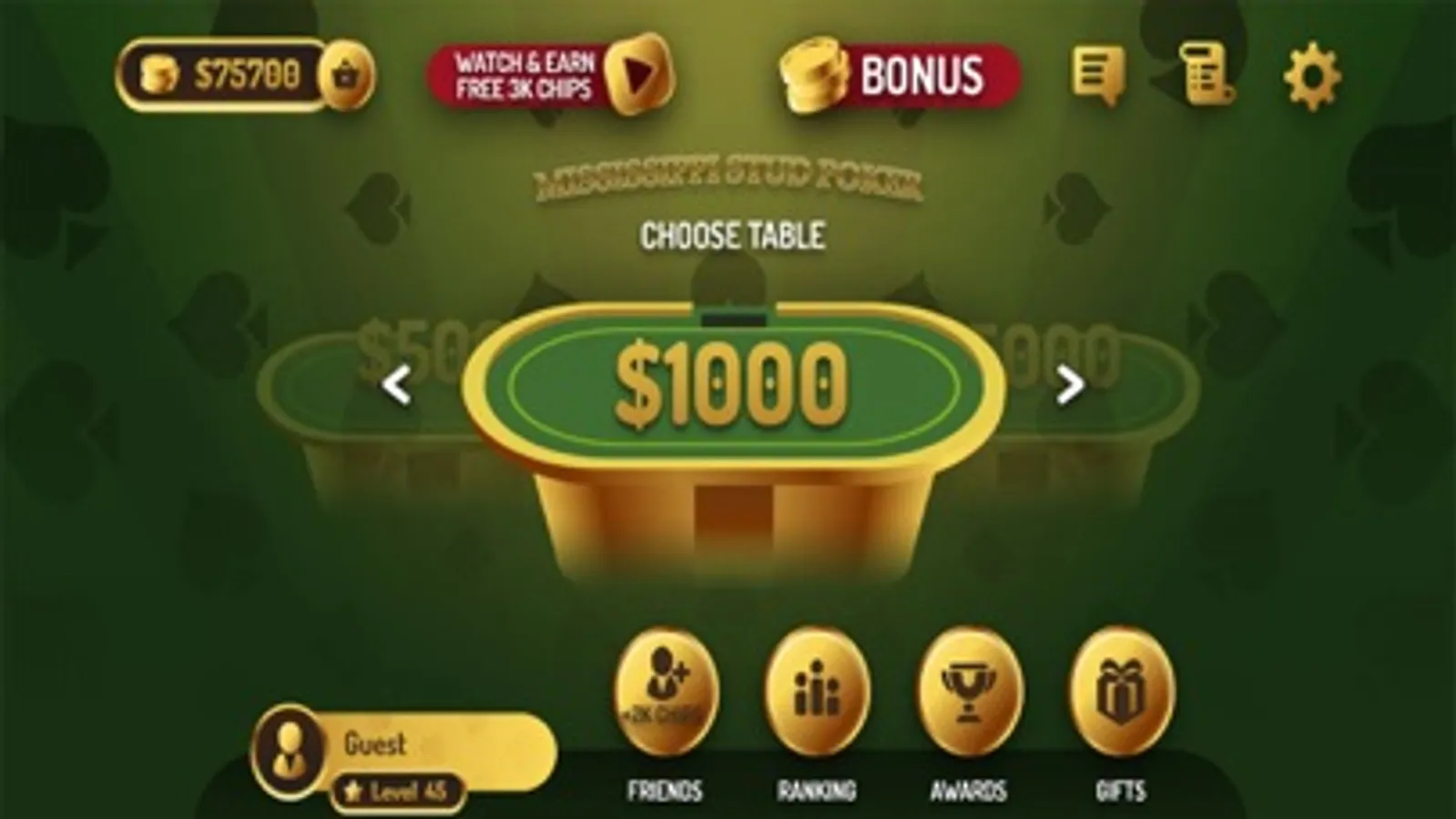 You can start playing Mississippi Stud Poker with 100,000 Bonus Chips as soon as you enter the game!