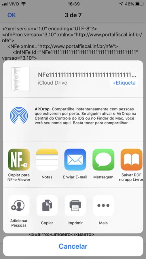 - Para visualizar as informações da Nota Fiscal Eletrônica abra o aplicativo a partir do painel Ações de Atividades do iOS, por exemplo, acessando-o através de anexos em emails ou através aplicativo Arquivos;
