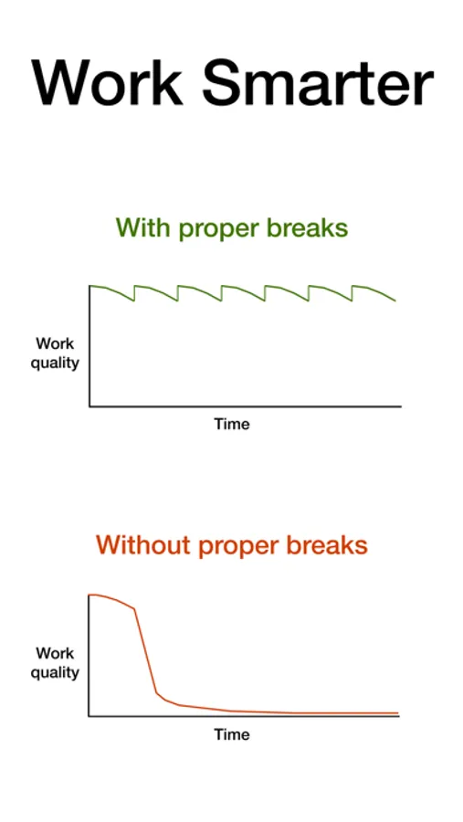 Work Smart Timer times 25 minutes of focus and 5 minutes of a break. After 2 hours Work Smart Timer times a 20-minute break.