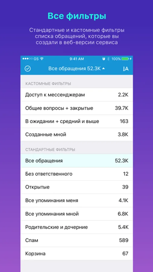 - Работа со стандартными и кастомными фильтрами, созданными в веб-версии сервиса