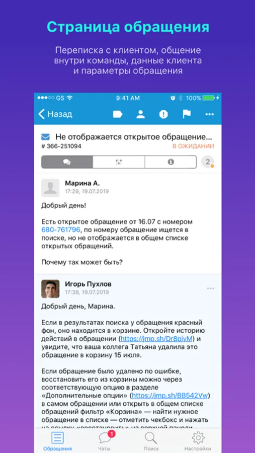 - Поиск обращений с историей поисковых запросов, синхронизированной с веб-версией