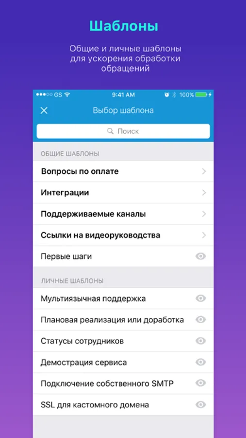 - Использование общих и личных шаблонов для быстрых ответов и действий