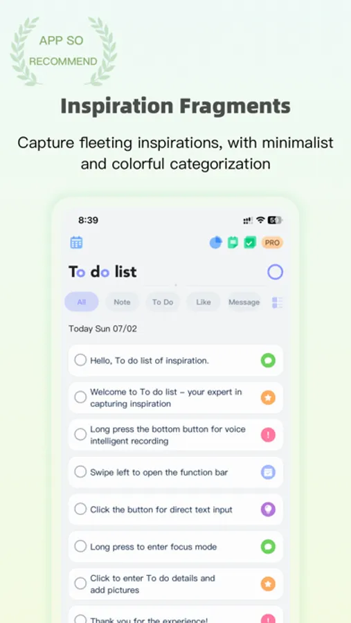 "To-do List - Record your inspiration", your exclusive inspiration capture tool, a lightweight, minimalist, efficient inspiration collection, voice memo, to-do list (Todo), schedule management (GTD) and reminder tool. Whether it is work, life or study, it will help you capture flashes of inspiration, or to-do lists, or work plans.