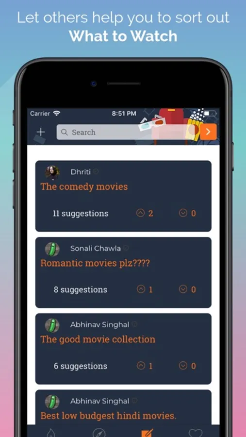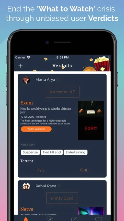 The idea is simple, people give a micro review of the flick they recently watch, through a ranking the hottest verdicts go to top. These verdicts gives you an awesome list of movies and tv series that you may watch.