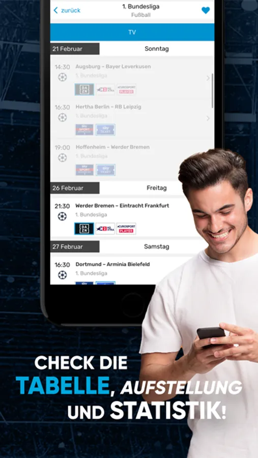 - Fügen Sie Spiele Ihrem persönlichen Kalendar hinzu, setzen Sie sich hierzu Erinnerungen und teilen Sie diese gegebenfalls mit Freunden via Facebook und Twitter.