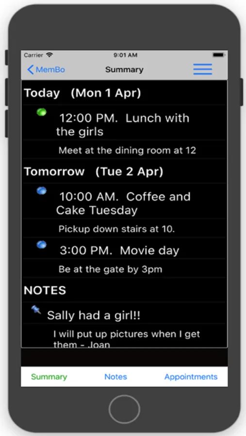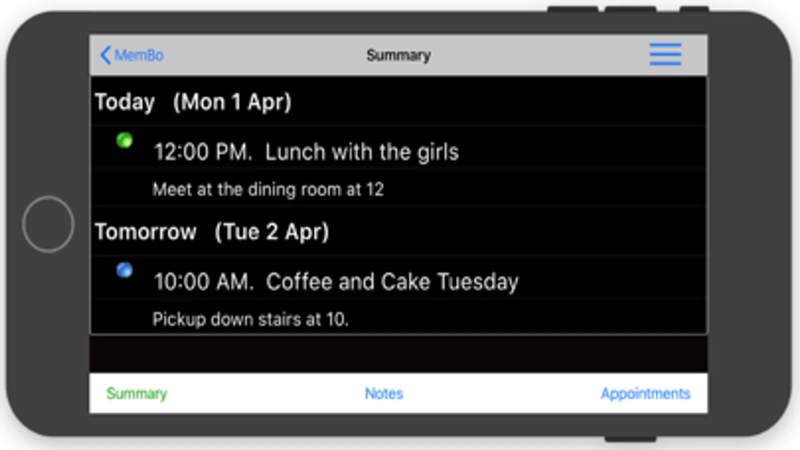 The MemBo Noticeboard App enables the update and immediate display of Appointments, Notes, and Photos on a Tablet or Mobile Phone.