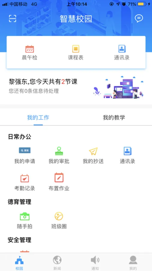 “章贡智慧教育(教师端)”APP是则包含了考勤、通知、办公、家校互动、晨午检、课表等云平台中教师经常使用的功能。通过APP让传统的工作方式更加简单话。有效的减轻教师的工作负担。从而促进智慧校园的实现。
