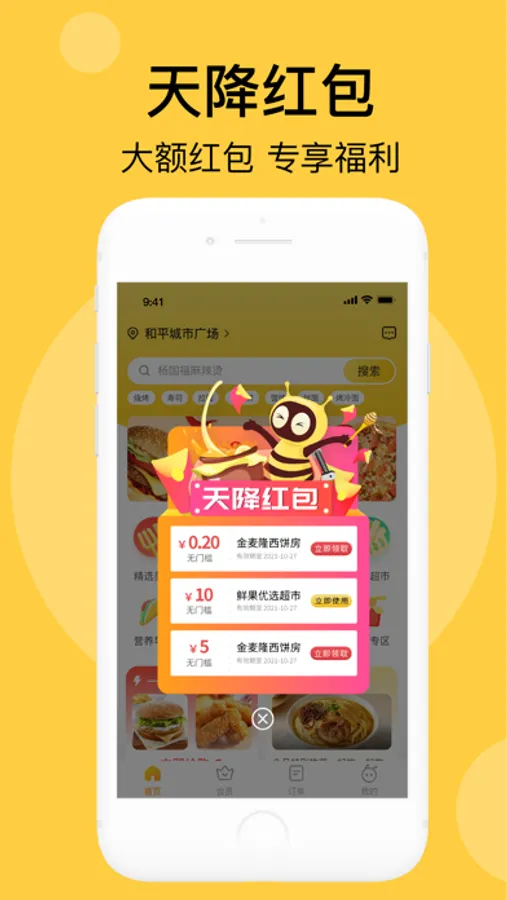 打开APP有惊喜!新用户注册即可领取大额无门槛优惠红包,更有“全城品质日”大额满减活动,优惠吃大餐。