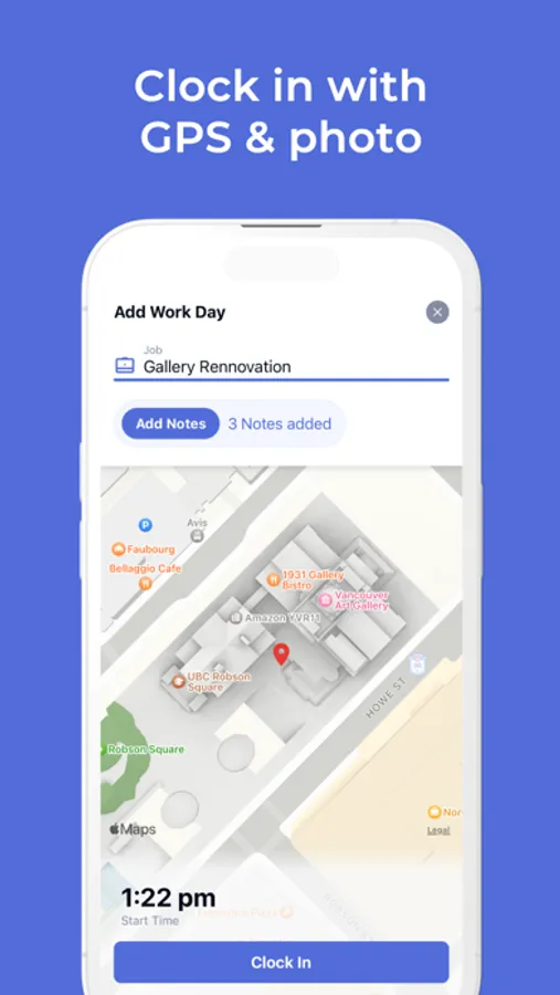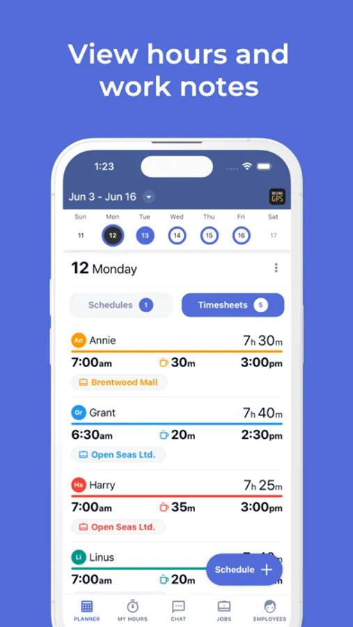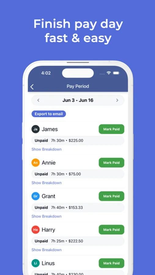 See when your employees are on the clock, if they arrived on time, and where their clock in and out happened with GPS. Get daily updates of your crew's timesheet organized by pay period. Choose between a detailed time log containing start, end, and lunch times, or simply the total hours worked for each shift. View overtime hours and export your timesheet as a pdf to email. The hours tracker gives you an update to date timesheet with total time worked to the day. It's a must for managing a mobile crew.