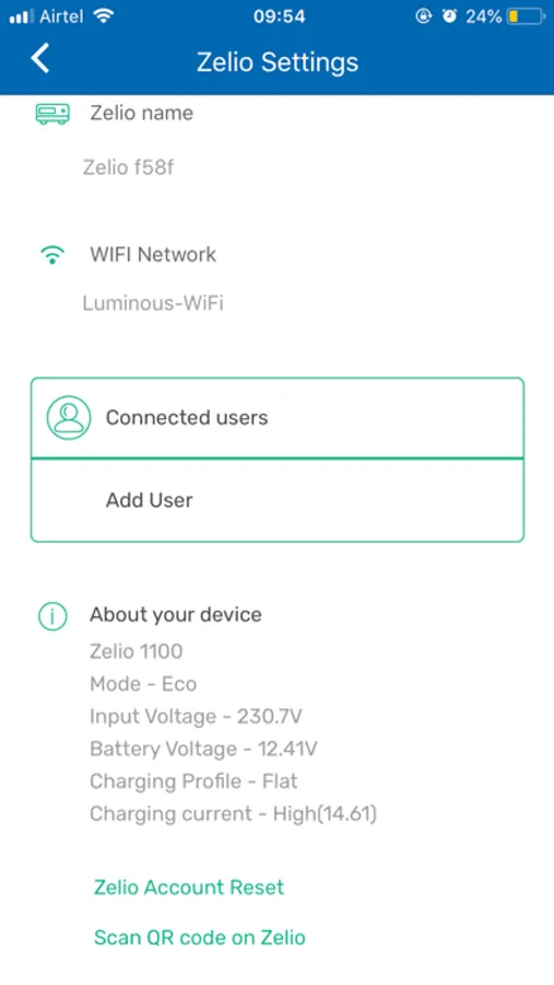 Zelio is an app to let you connect with your Zelio inverter device through Wi-Fi. It shows information like available backup, battery percentage, time to full charge and other setting parameters. You can also connect to it remotely and have access to your Zelio even when you are away from your home.
