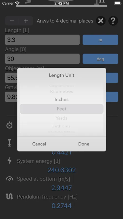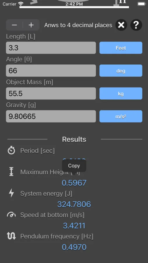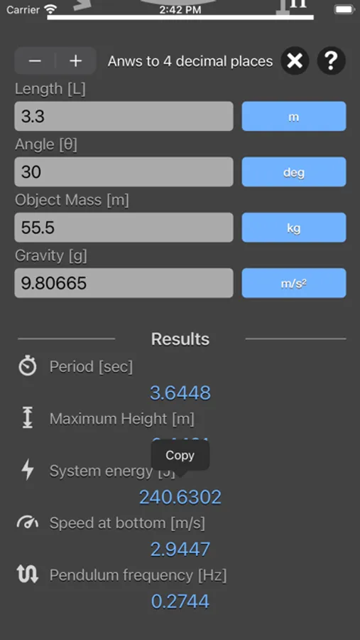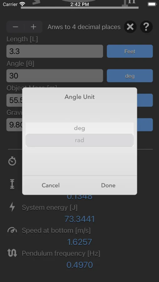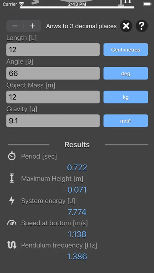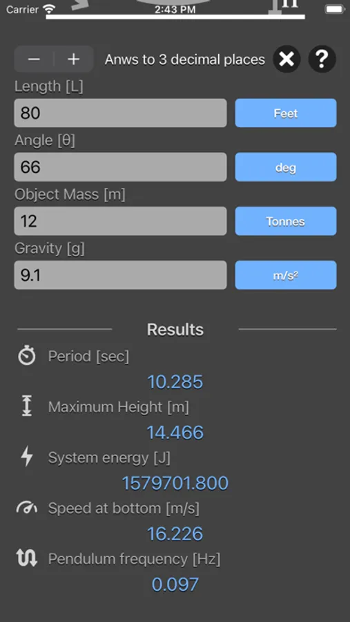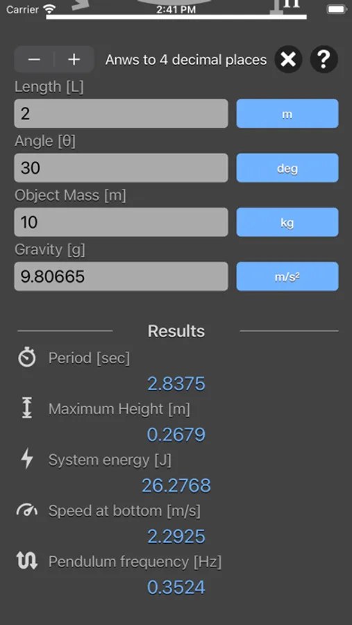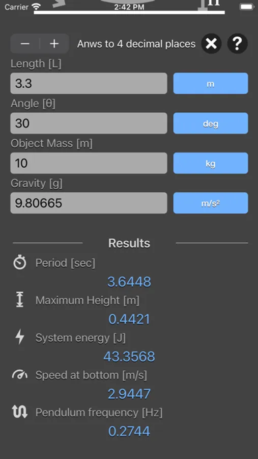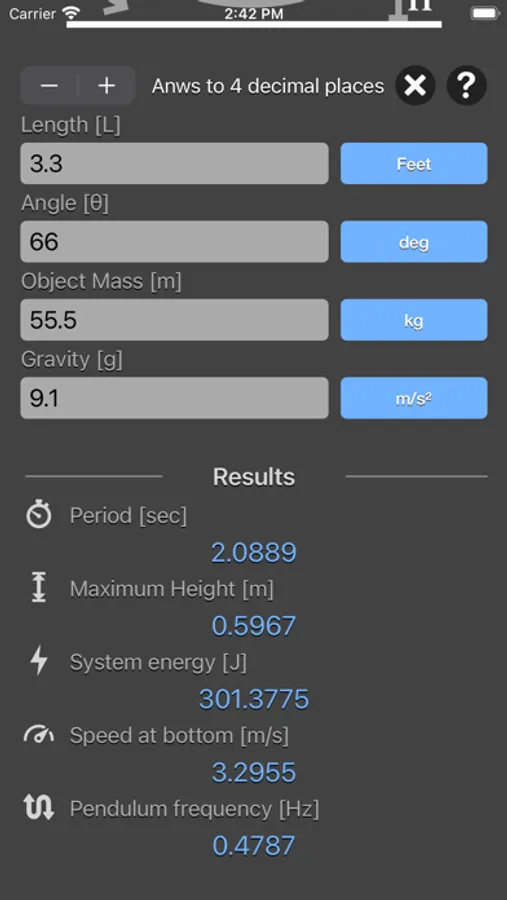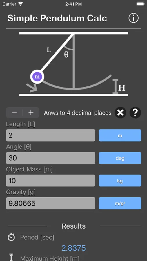 Simple Pendulum Calculator are physic/math calculator to find pendulum period, frequency, maximum height, energy of system or speed at bottom fast and easy.