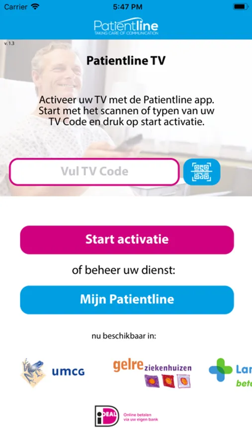De gratis betaal app van Patientline is een gebruiksvriendelijke manier om tijdens uw verblijf in het ziekenhuis de TV te kunnen activeren.
