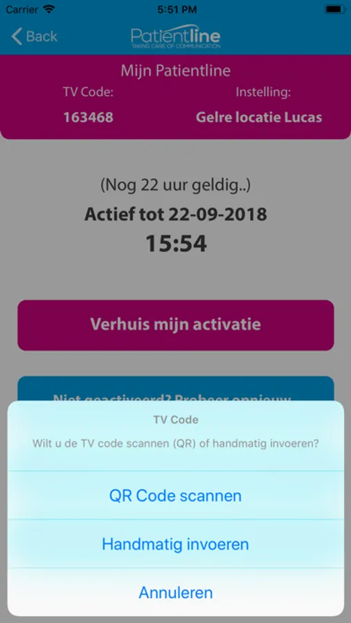 De QR code en de TVcode kunt vinden op de Patientline sticker bij uw bed.