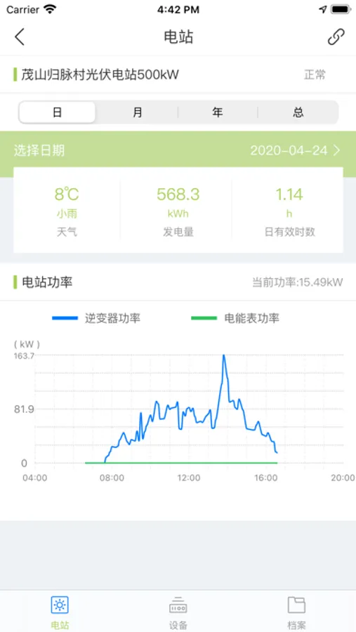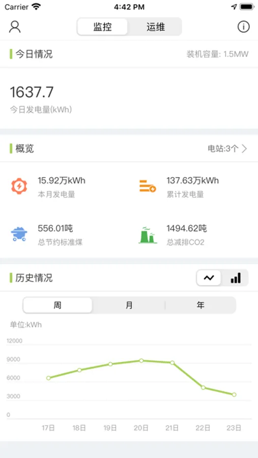 用户可以查询电站以及电站设备的发电及运行情况,对电站进行实时监测。同时可以从日、周、月、年不同维度查询电站的历史发电情况,对电站的所有发电信息有清晰的了解。