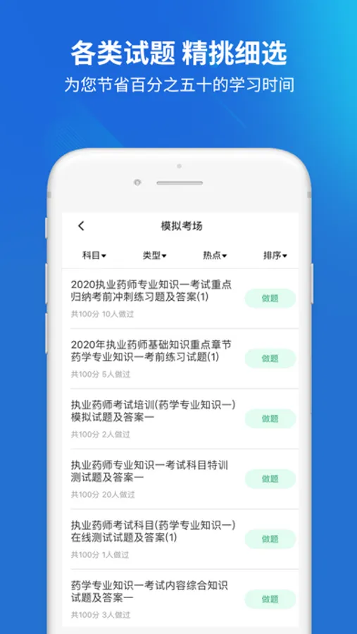执业药师考试题库有模拟考场、历年真题练习、每日一练、快速练习、考点练习、考试押题、做题记录等多种学习与做题模式、丰富多样化的陪你一起考执业药师。
