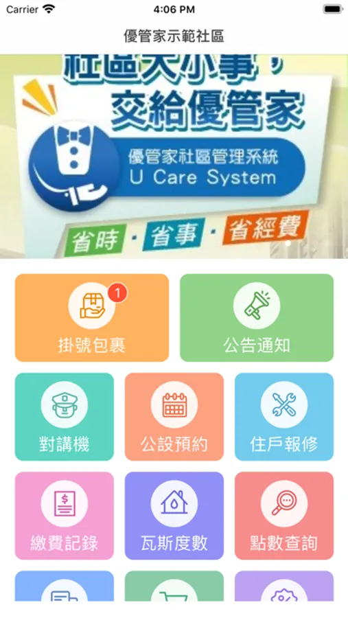 APP提供住戶呼叫社區保全功能,同時可以領取查詢掛號郵件,報修公設,預約公設,收取查看通知公告,所有居住在社區所需要的服務全數提供。