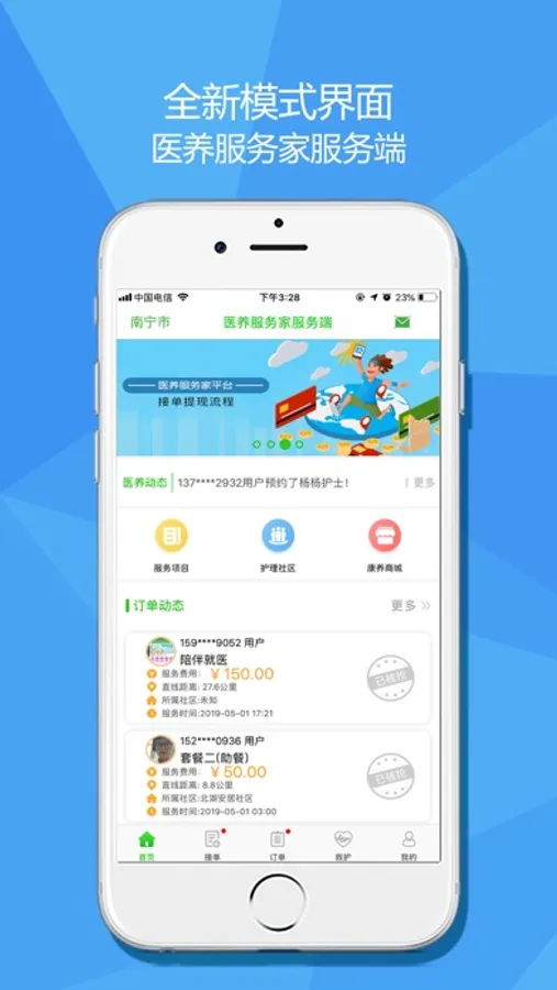 南宁医养服务家投资有限公司成立于2016年7月,顺应国家老龄化社会的大背景,专注于养老服务。公司致力开发的核心产品——医养服务家App,是我国首个专注养老护理服务及家政护理服务一体的O2O平台。平台运用互联网+护理+养老+家政的模式,实现供需双方线上发布、在线撮合预约、在线订单形成、线下服务、在线支付、在线评价等功能。App主要分成三大模块:找护理、找家政、紧急呼叫。找护理模块提供医院陪诊、上门护理(居家陪护、疼痛护理、伤口护理、管道护理、中医理疗、临终关怀)等数十项专业护理服务。找家模块提供月嫂、保姆、医院陪护、上门维修、代办事物、上门洗头、上门保洁等服务。紧急呼叫模块为有紧急医疗救助的人提供呼叫就近医护人员现场施救的服务。用户根据自身需求可实现在线下单,即时发布,迅速调动周边医护人员、家政服务人员资源上门或到现场提供及时服务。