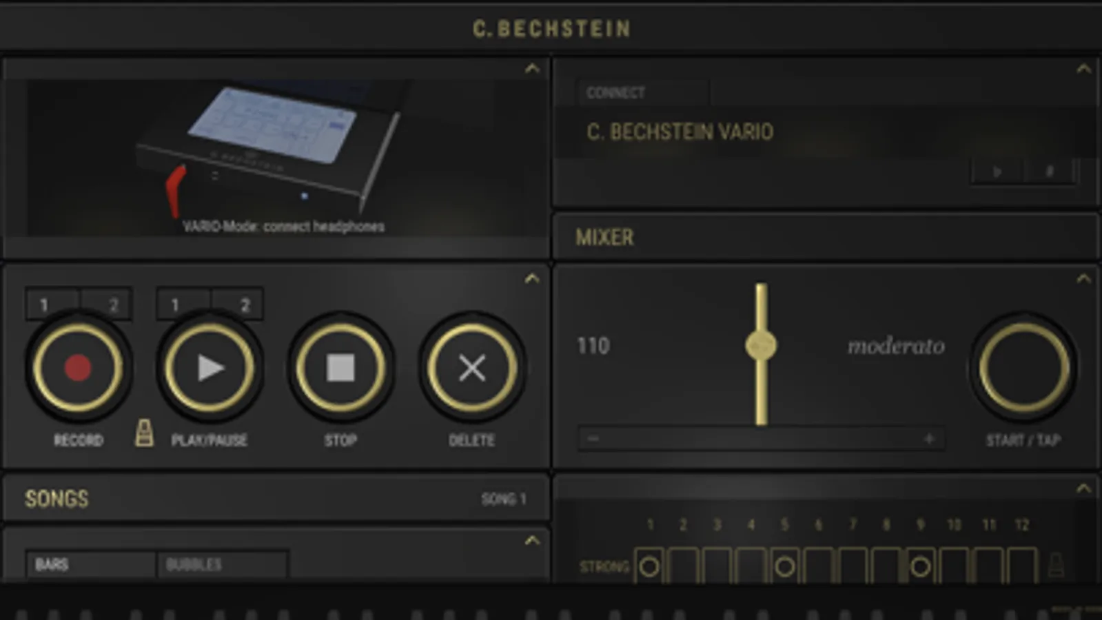 VARIO is an installation option for acoustic pianos and grand pianos by C. Bechstein, W. Hoffmann and Zimmermann. VARIO combines the acoustic instrument with numerous advantages, known from premium digital pianos and allows an uncomplicated connection to apps on smartphones, tablets and PCs via Bluetooth or USB-C. The VARIO is the ideal solution for the acoustic piano.