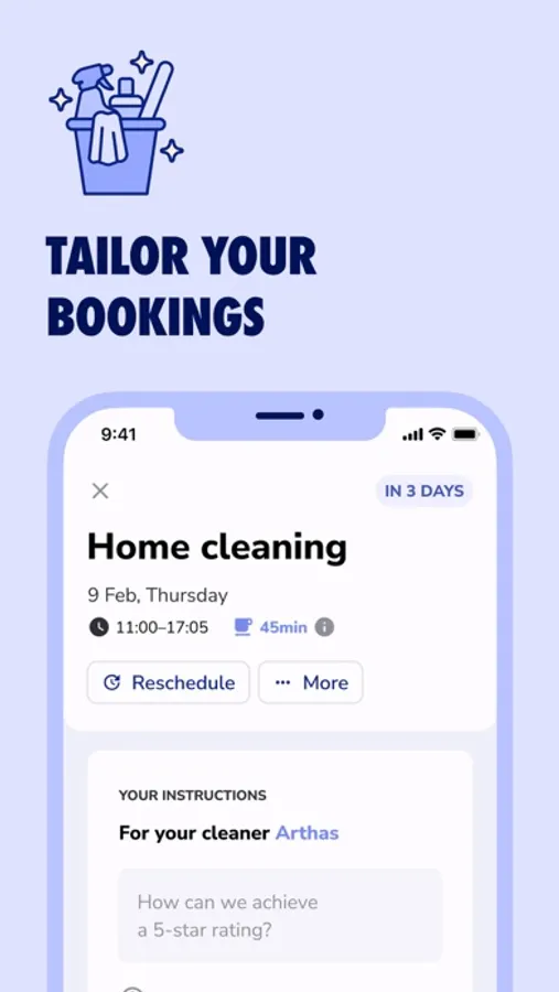 See your upcoming (and past) bookings and provide instructions for your cleaner. We will remind you!
