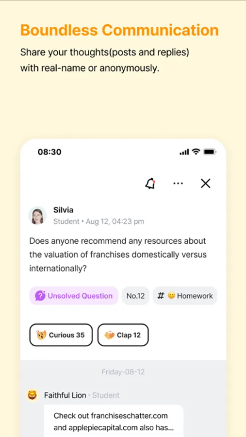Click ‘Clap’, ‘Curious’, ‘Interested’, ‘Like’, and ‘Solved’ SUMoji buttons to easily interact with others. Experience the power of social learning.