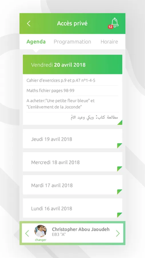 Families can access all information about the agenda, yearly plan, schedule, exams, report card, memo, weekly activities, breaking news, absences, visits to the infirmary and remarks via their mobile device.