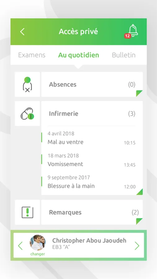 Les familles peuvent accéder à toutes les informations concernant l’agenda, la programmation, l’horaire, les examens, les bulletins, les circulaires, les activités hebdomadaires, les dernières nouvelles, les absences, les passages à l’infirmerie et les remarques sur leur appareil mobile.