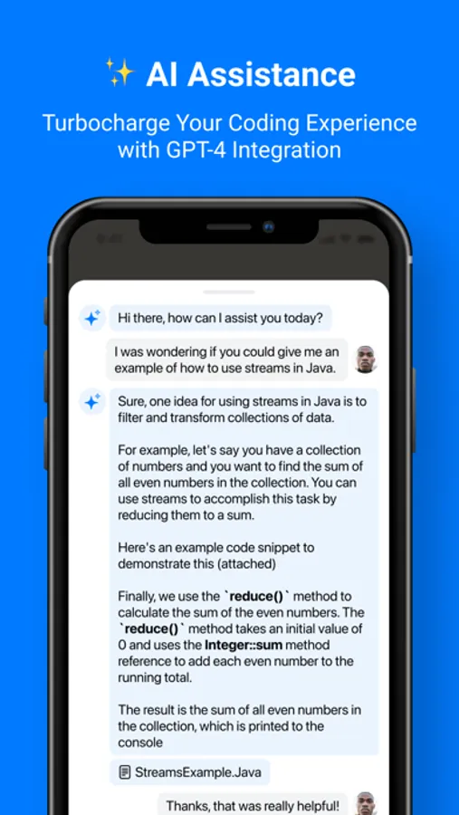 Now integrated with GPT-4, CodeSnack IDE brings AI-enhanced development features to your mobile device: