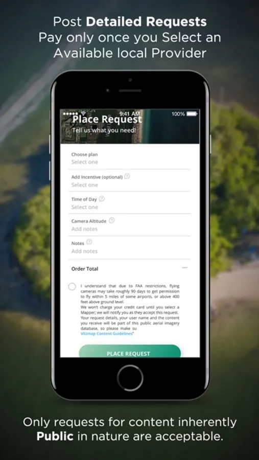 Viewing Aerial Pictures and placing Requests is free; pay only once you select an available local provider (No Mappers available? orders are automatically canceled after 7 days at no charge).