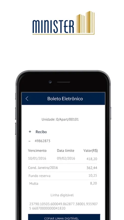 Seja para pegar a 2ª via do boleto, consultar seu histórico de pagamentos ou visualizar a última ata da assembleia, o app da Minister estará ao seu lado para facilitar o seu dia a dia.