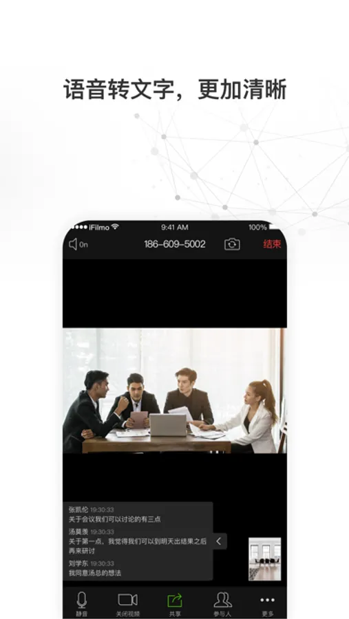 In addition to audio and video, you can also communicate in the meeting by text. And it provides real-time voice-to-text function, let you clear the content of the meeting. After the meeting, you can quickly browse the meeting highlights through a shareable meeting minute.