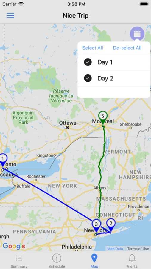 8. Show the trip routes on the map, all the days can be displayed together using different color schemes, or they can be displayed day by day.