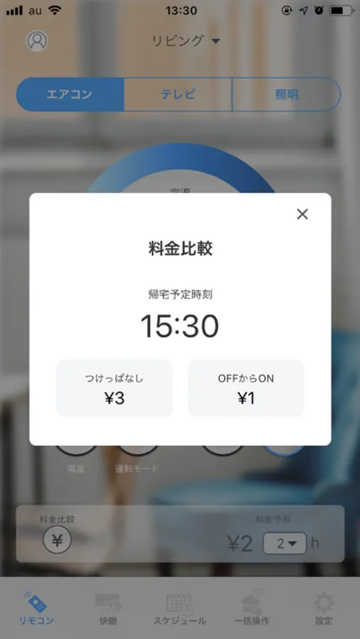 また、電気代予測機能では、ご自宅のエアコンに合わせた電気代の予測や、ちょっとした外出時にエアコンを切った場合とつけっぱなしにした場合の電気代予測が確認できます。