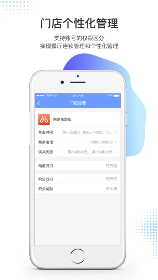 门店个性化管理:支持账号的权限区分,实现餐厅连锁管理和个性化管理。