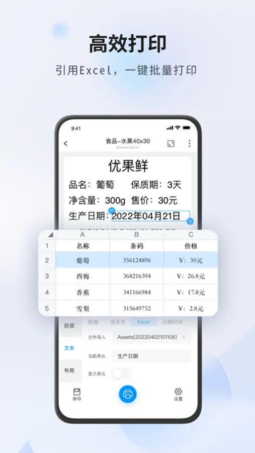 支持Excel格式文件一键导入,实现批量多样化的打印。支持序列化打印,可通过设置流水号,轻松实现编码自动快速编排,省心省力,让您批量打印无烦恼。