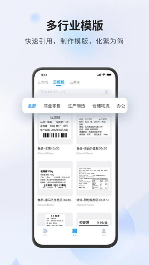 内置服装、商超、食品、珠宝、物流和零售等行业模板,百种样式任您选择,满足各行各业的使用需求,让您使用无忧。