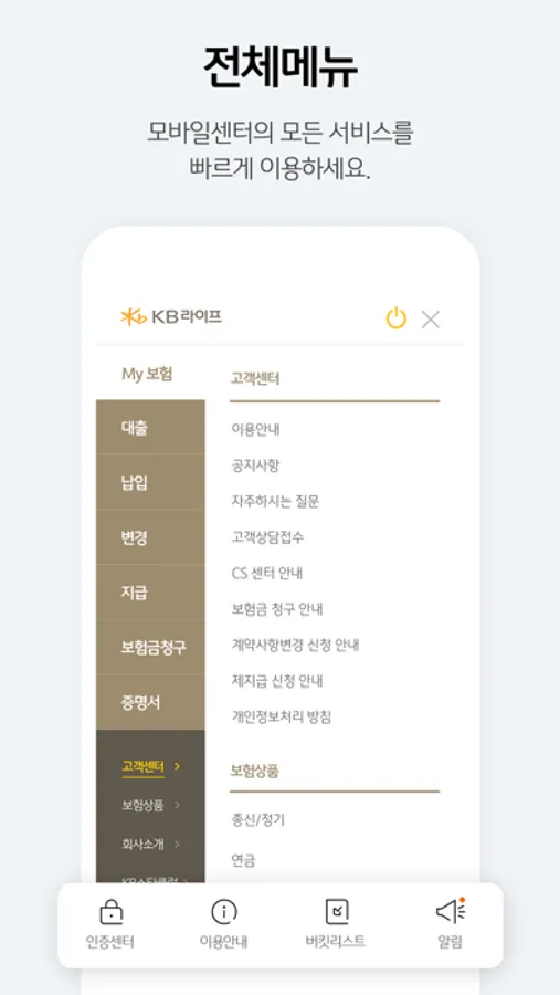 -기타: 라이프파트너® 조회, 보장리뷰 신청하기, 버킷리스트, 인증센터, 이용안내, 알림, 회사소개