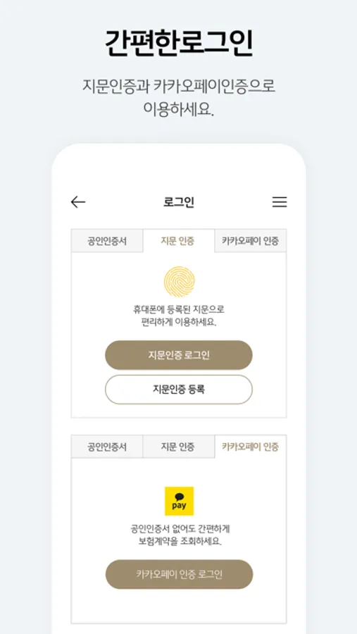 -카카오페이인증 로그인: 공인인증서가 없어도 ‘이름+생년월일+휴대전화번호' 입력 및 카카오페이 인증 후 서비스 이용이 가능합니다.