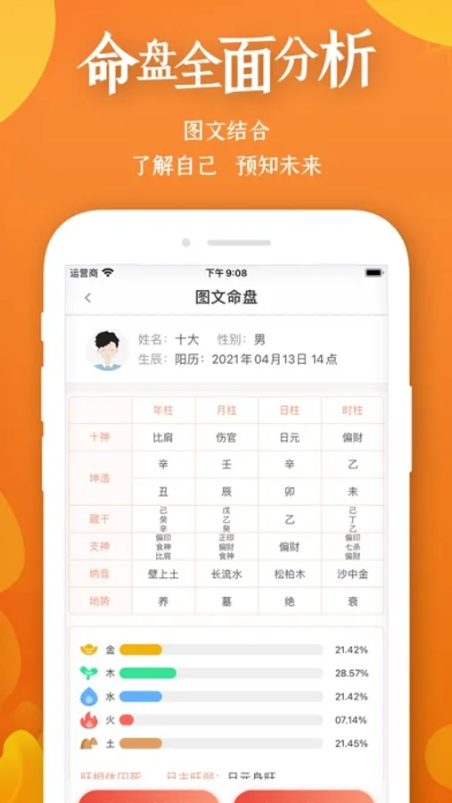 八字算命应用查阅诸多古籍,结合传统生辰八字为你免费专业排盘,图文并茂,全面剖析,让你一目了然。