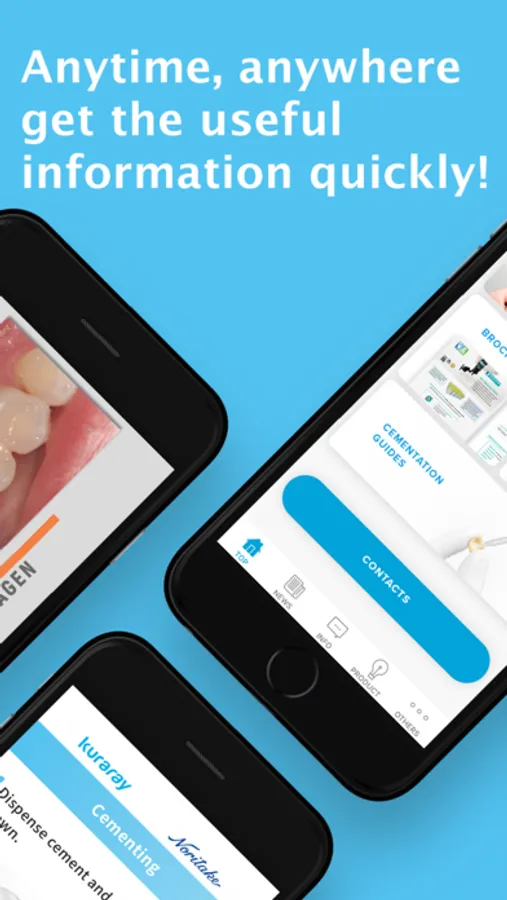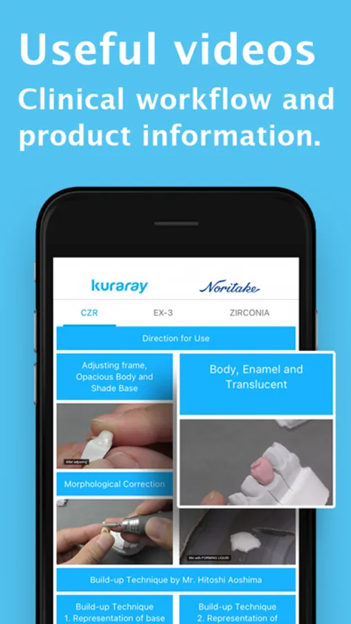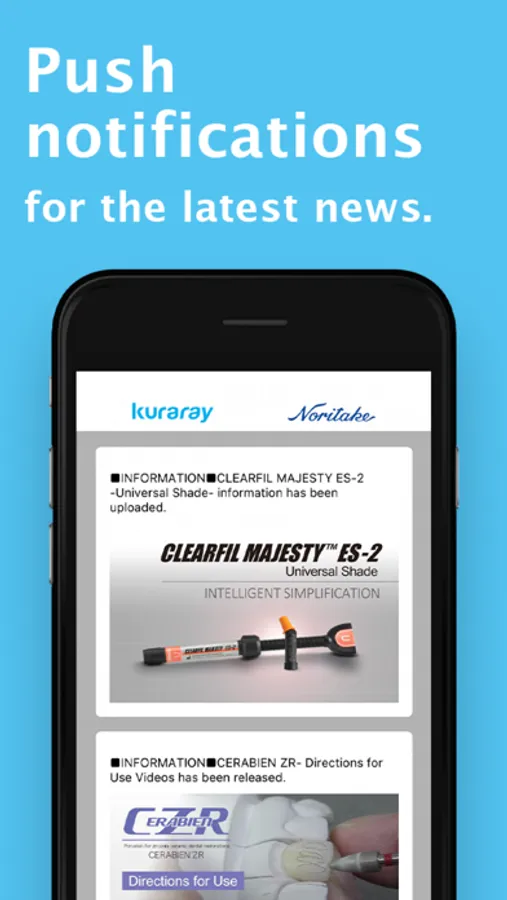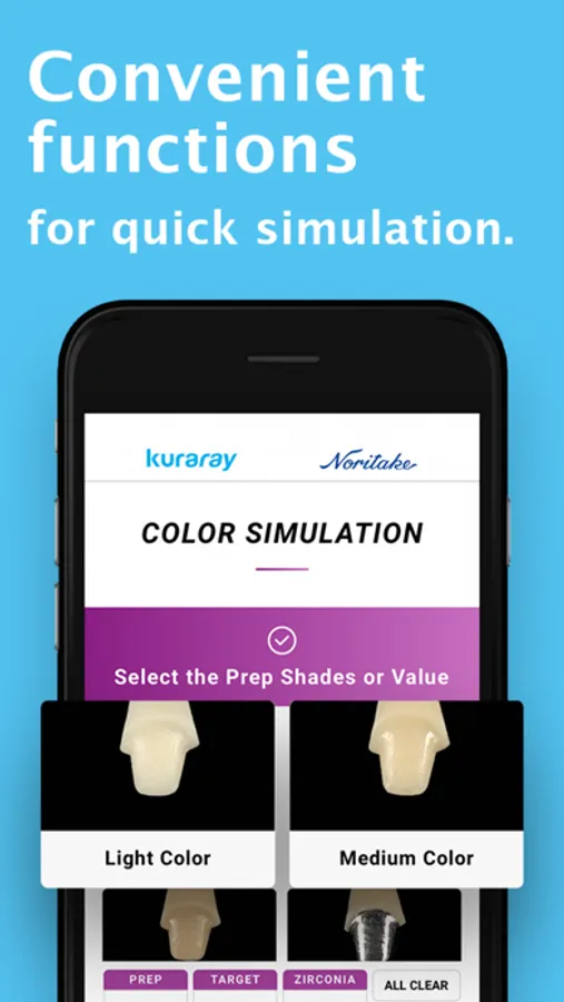 The app provides "Cementation Guide" and "Color Simulation" to check the steps to use Kuraray Noritake Dental's cement products, as well as the latest news and product information.