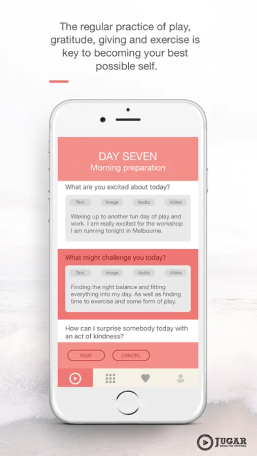 Our inner thoughts are critical; they can control the start and end of our day. Your morning will start with three questions. By answering the three simple Jugar questions, you will have a clear path and objectives for the day. Focusing on small wins and achievable goals for the day, you are creating a pattern of success. These daily questions will challenge your usual pattern of thinking and will focus on encouraging mindfulness and embracing gratitude. The regular practice of Jugar’s four key pillars; gratitude, play, giving and exercise is the key to becoming your best possible self.